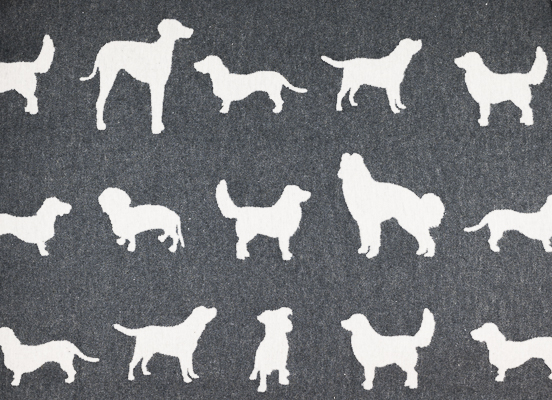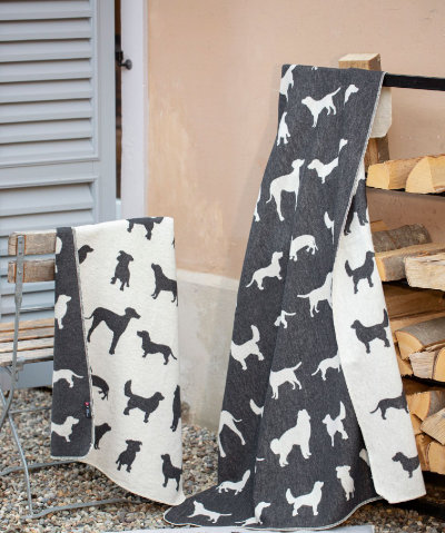 Hier siehst Du die Kuscheldecke "Hundesilhouetten" in anthrazit/natur, Grösse 100/140cm. Kuscheliger Einsatz im Bett, auf der Couch, im Auto, für unterwegs ....