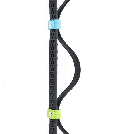 Oft ergibt sich im Reitunterricht der Satz „nimm mal die Zügel kürzer“ gepaart mit der Frage „um wieviel?“ Dem wollten wir gleichzeitig entgegenwirken und haben die Stege zwischen den Schlaufen paarig mit Farbe versehen. Jetzt kann der Satz lauten „nimm mal die Zügel kürzer auf Gelb“.